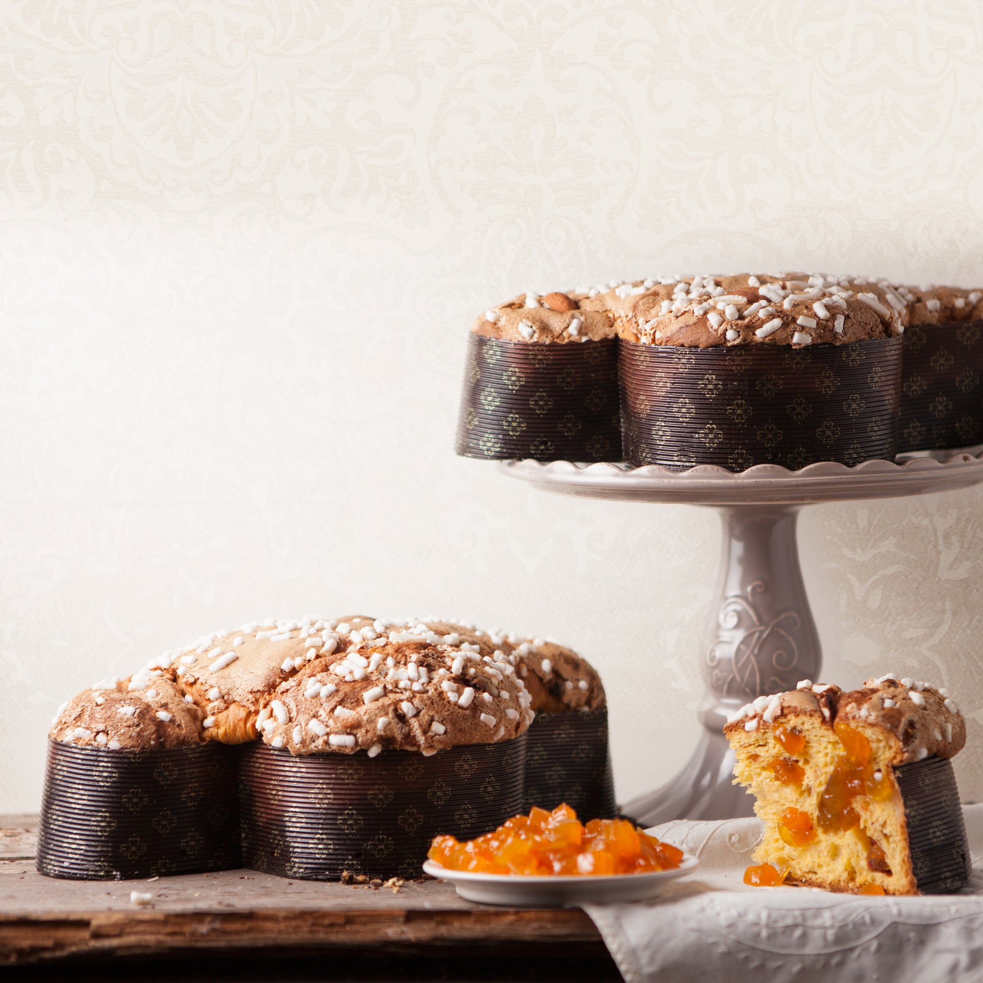 INGREDIENTI: Farina di FRUMENTO, Zucchero, Frutta Semicandita Albicocca (21,6%) (UE) (Albicocca, Sciroppo di glucosio-fruttosio, Saccarosio, Acidificante acido citrico, Conservanti (potassio di sorbato)), Acqua, BURRO, UOVA di gallina allevate a terra, Lievito Naturale da Madre Bianca (Farina di FRUMENTO), Zucchero invertito, Farina di Malto di GRANO TENERO, Sale, Burro di cacao, Miele, Aromi, Aroma naturale di vaniglia di Tahiti. GLASSATURA: Zucchero, Armelline, Amido modificato (E1414), Aromi, ALBUME D'UOVO, Farina di MANDORLE. GUARNIZIONE: Zucchero in granella, MANDORLE (2,3%). Può contenere tracce di: SOIA, SESAMO, SENAPE, FRUTTA A GUSCIO.