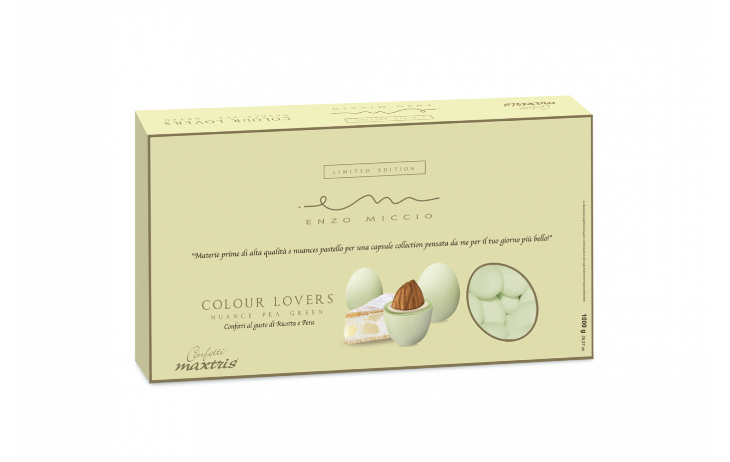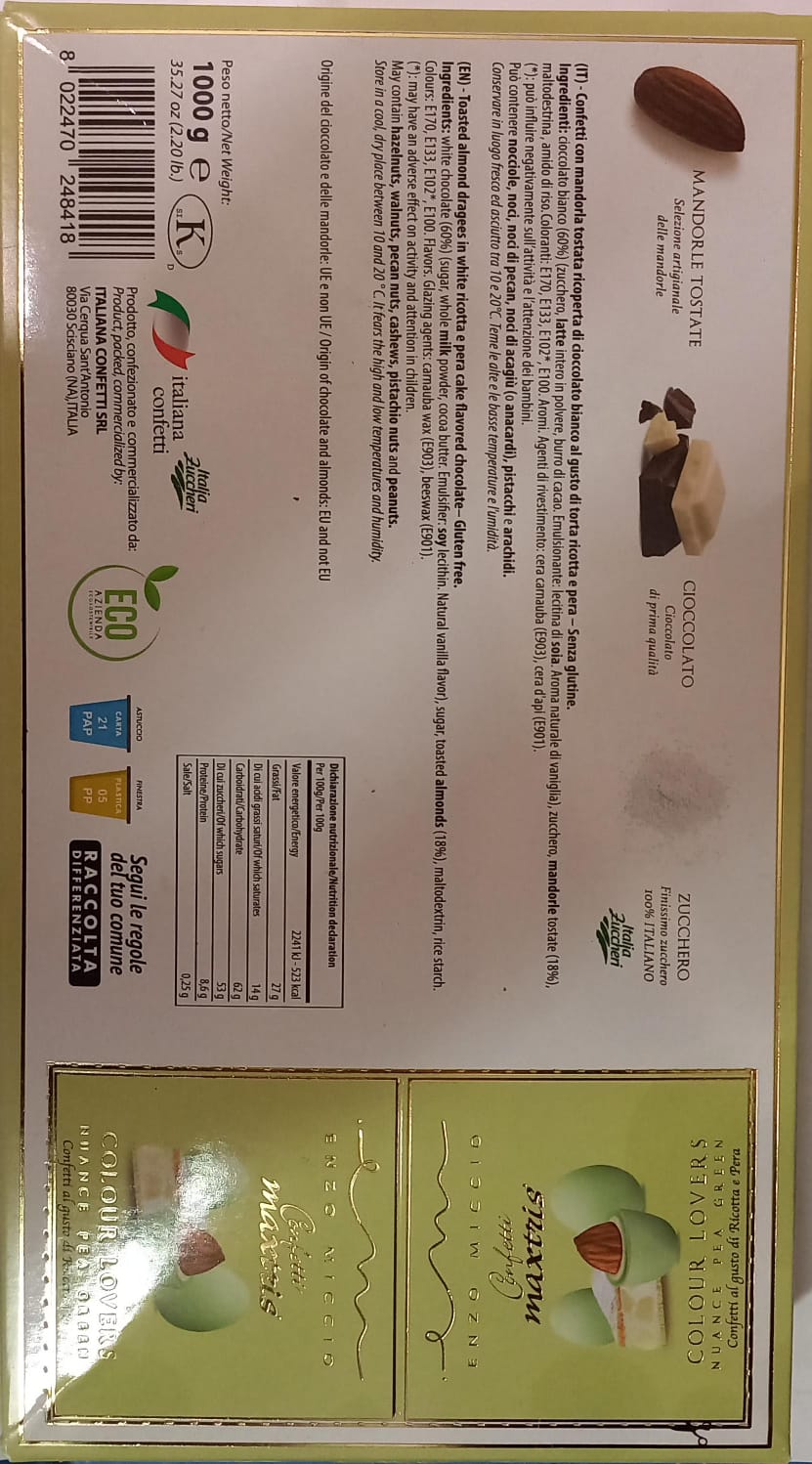 Mandorla tostata ricoperta da cioccolato bianco al gusto di torta ricotta e pera e da un sottile strato di zucchero.