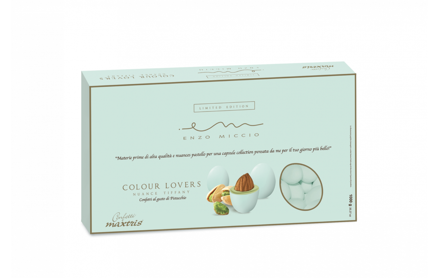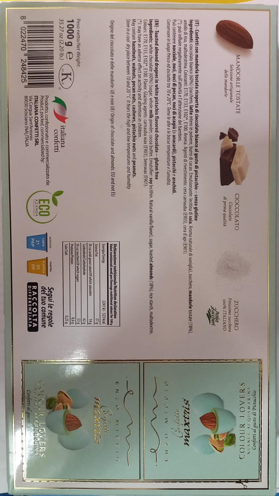 Mandorla tostata ricoperta da cioccolato bianco al gusto di pistacchio e da un sottile strato di zucchero.