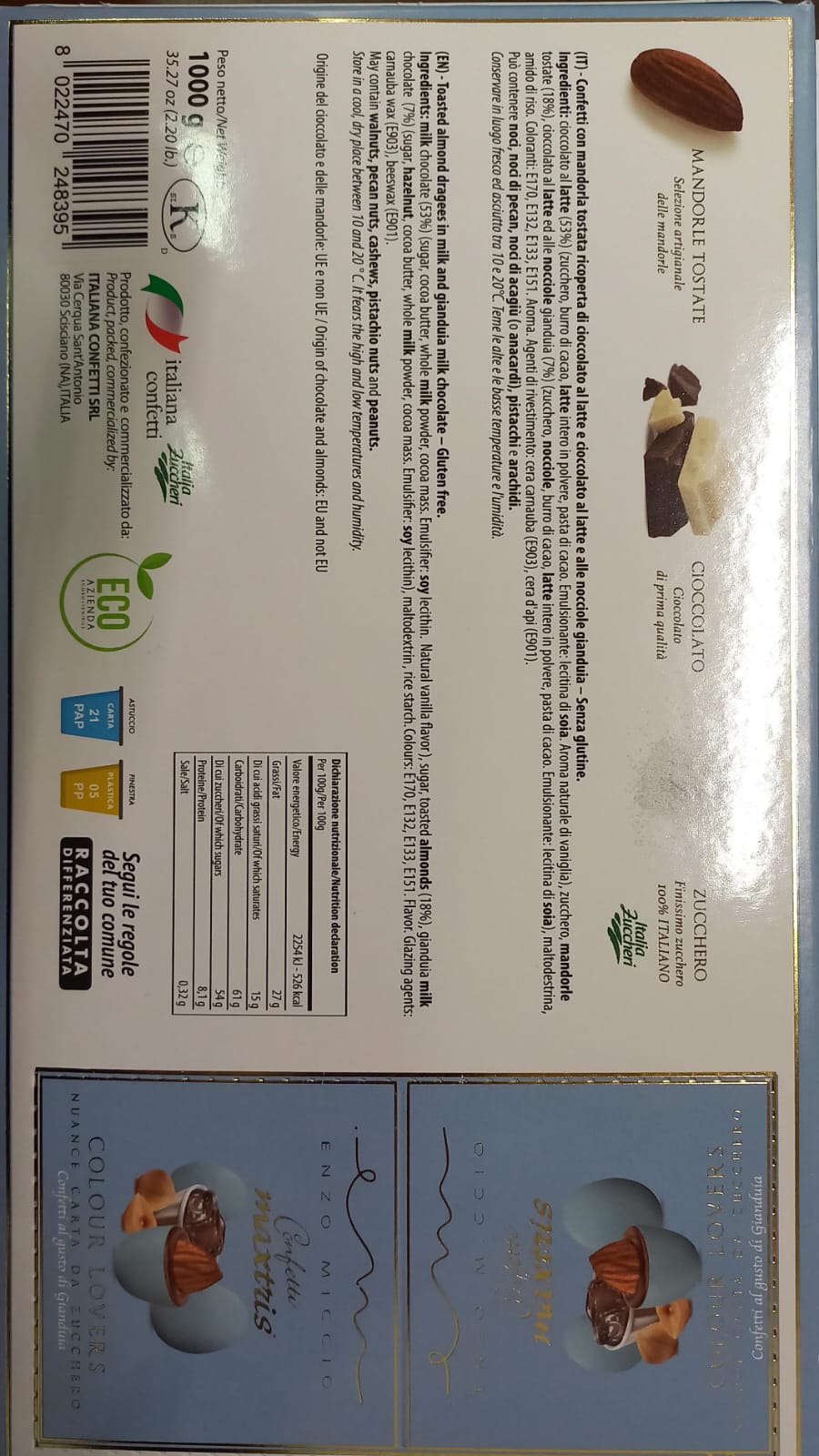 Mandorla tostata ricoperta da cioccolato al latte e alle nocciole gianduia e da un sottile strato di zucchero